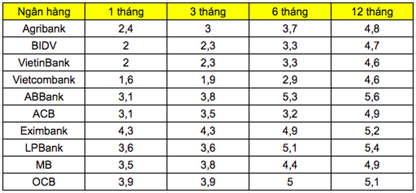 Các ngân hàng thương mại có vốn Nhà nước (big 4) gồm Agribank, BIDV, Vietcombank, VietinBank duy trì ở mức thấp nhất hệ thống và không biến động nhiều thời gian qua. Các đơn vị này niêm yết lãi suất cao nhất hiện là 4,8%/năm, trong khi lãi suất thấp nhất chỉ 1,6%/năm.