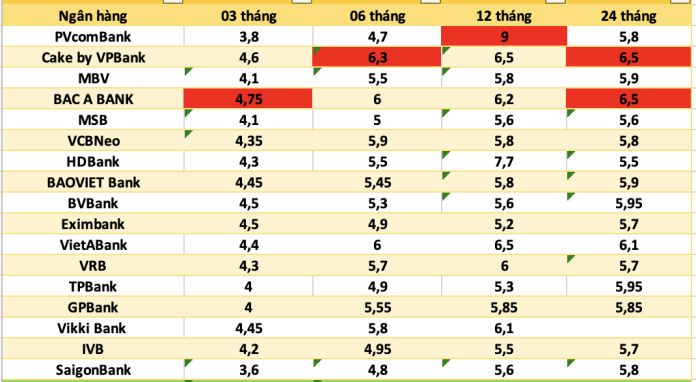 - Bac A Bank áp dụng 6%/năm kỳ hạn 12 tháng, 6,1%/năm kỳ hạn 13-15 tháng, 6,3%/năm kỳ hạn 18-36 tháng.