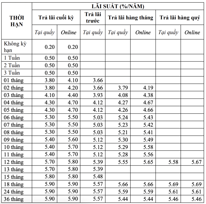 Mức lãi suất tại quầy và trực tuyến dao động từ 3,8% đến 5,9%/năm,