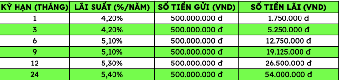 Áp dụng công thức trên, khi gửi 500 triệu đồng tại VPBank, khách hàng cá nhân gửi trực tiếp tại quầy có thể nhận được mức lãi như sau: