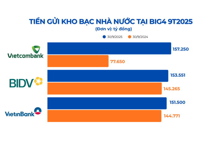 Báo cáo tài chính quý III/2025 của nhóm ngân hàng Big4 gồm Vietcombank, VietinBank và BIDV cho thấy, số dư tiền gửi của Kho bạc Nhà nước (KBNN) tại ba nhà băng này đạt khoảng 460.000 tỷ đồng tính đến 30/9/2025, tăng gần 26% so với cuối năm 2024.